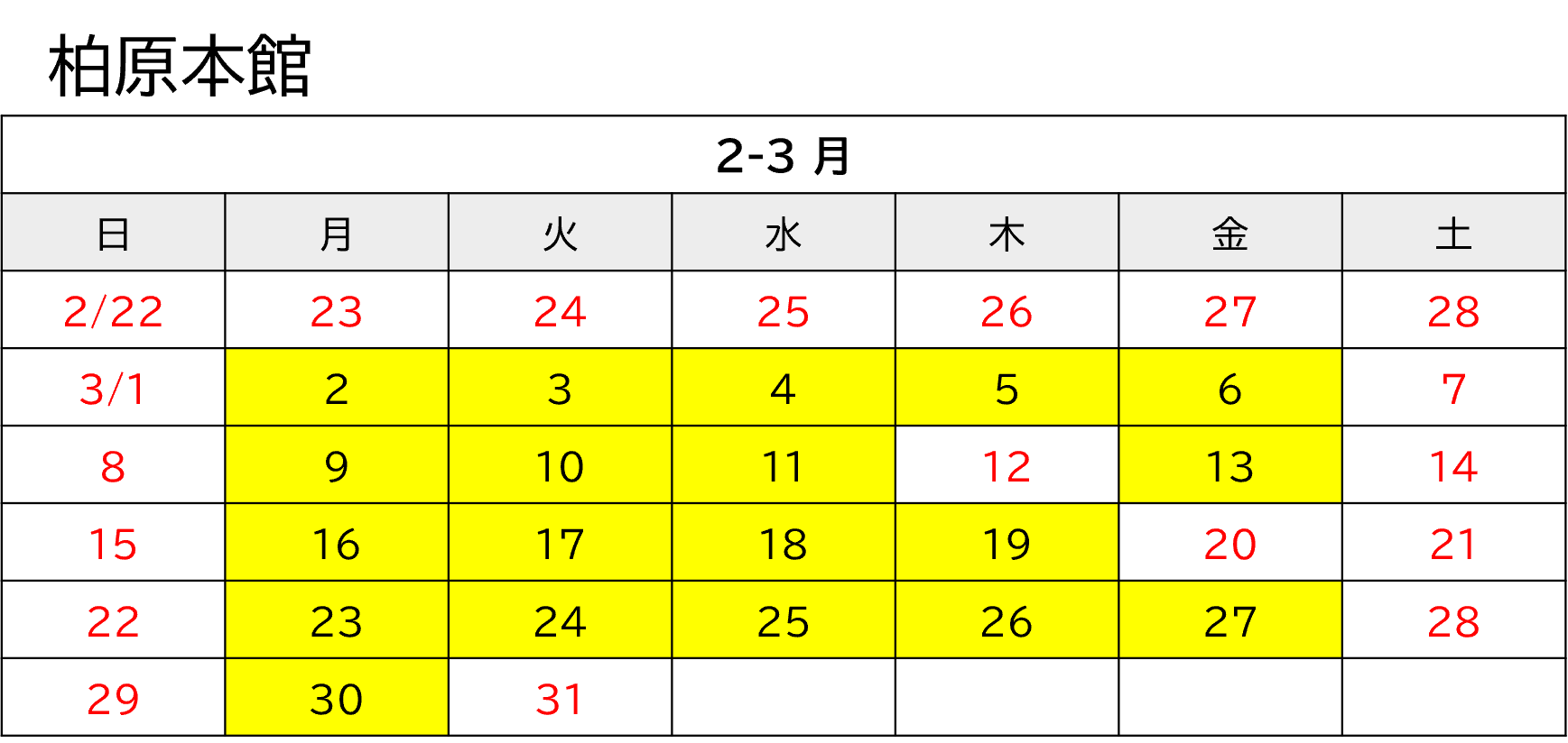 休館日(土日祝), 3/12 入試 , 3/31 館内整理日