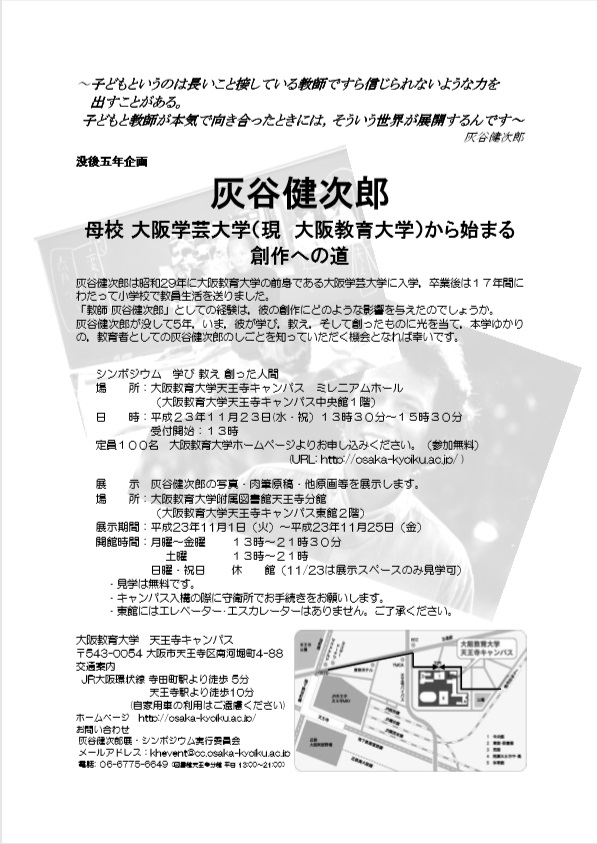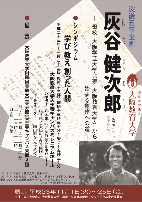 2011年11月 「没後五年企画 灰谷健次郎 -母校 大阪学芸大学(現 大阪教育大学)から始まる創作への道-」を天王寺分館にて開催