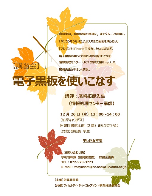 【日時】 平成30年12月26日(水) 13時00分~14時00分 【場所】 附属図書館(柏原)本館(2階)まなびのひろば 【講師】 尾崎拓郎先生(情報処理センター講師) 【説明】 教育実習,模擬授業の準備に,またグループ学習に。 「パソコンをつなげたい」「スマホの画面を映したい」 「プレゼンをiPhoneで操作したい」などなど, 電子黒板の知っておきたい便利な使い方を情報処理センター (ICT教育支援ルーム)の尾崎先生がやさしく解説。 【対象】 教職員,学生 申し込み不要 【主催】 附属図書館