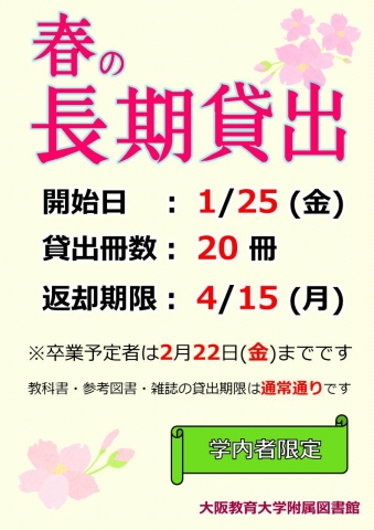 ・卒業予定者の返却期限は、2月22日(金)です。 ・教科書, 参考図書, 雑誌の貸出期限は通常通りです。 ・長期貸出した資料は更新(延長)できません。